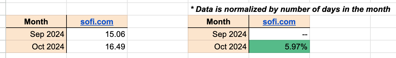 Website Traffic: SoFi.com saw a 5.97% increase in activity from September to October 2024 (data normalized by number of days in the month), from 15.06M to 16.49M.